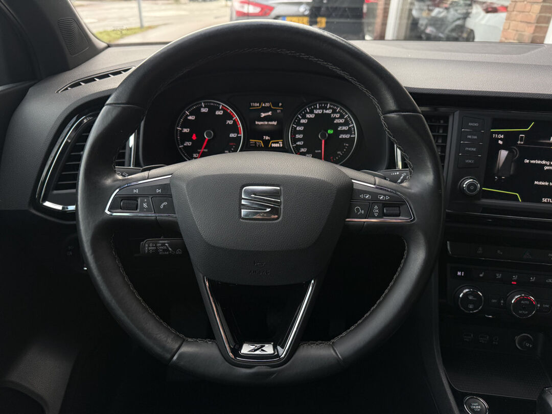Niets achter deze auto blijft verborgen door de achteruitrijcamera. Een veilig gevoel! De auto is voorzien van een trekhaak en is een uitstekende caravantrekker. Een smartphone met internetverbinding legt eenvoudig overal contact met de auto. U kunt functies activeren en de conditie van de auto monitoren. Deze SEAT is voorzien van knoppen op het stuur om het navigatiesysteem en het audio-installatiesysteem met DAB-ontvangst te bedienen. Met de automatische airconditioning selecteert u de gewenste temperatuur. Het systeem doet de rest. De uitrusting van deze auto is met sportstuur met schakelpaddels, regensensor, cruise control, keyless entry, buitentemperatuurmeter en automatisch dimmende binnenspiegel behoorlijk compleet.